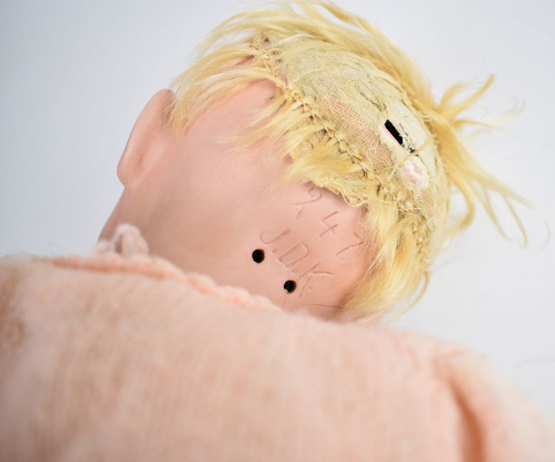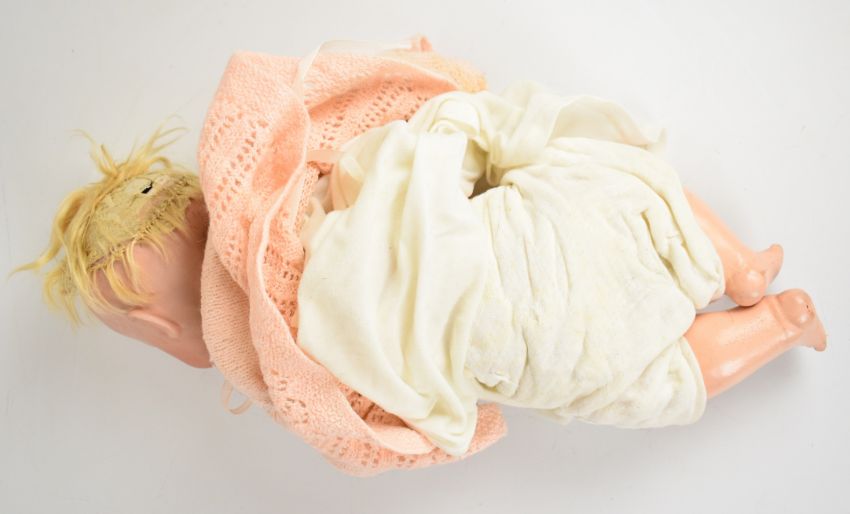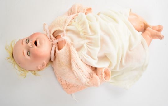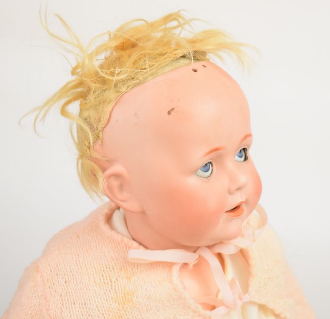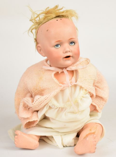 Kestner bisque headed doll with open mouth, weighted blue eyes and painted features, JDK 247 14 markings to the back of neck, height 44cm