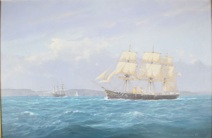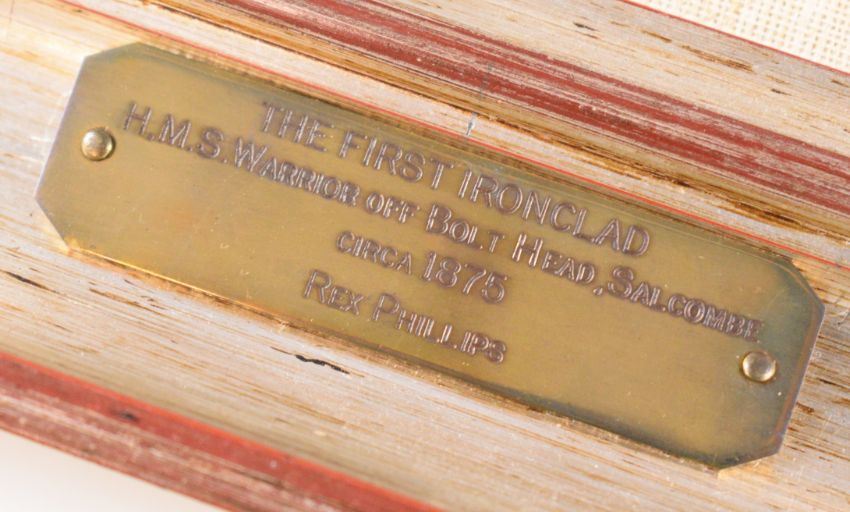 Commander Rex Phillips (British, 1931-2015) Royal Navy interest oil on canvas titled 'The First Ironclad, HMS Warrior Off Bolt Head, Salcombe circa 1875' to brass plaque lower edge of the frame, signed and dated 84 lower right, 50 x 74cm, in part gilt frame