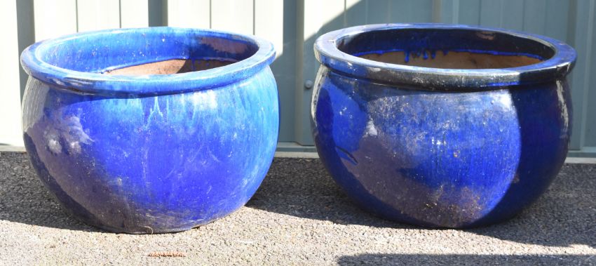 Near pair of blue jardinières / garden planters, diameter 50 x height 32cm