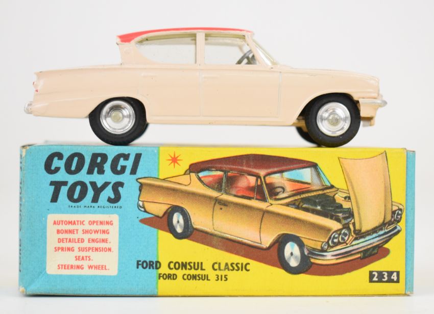 Corgi Toys diecast model Ford Consul Classic 315 with two tone pink body/roof and lemon interior, 234, in original box.