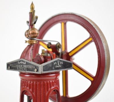 Tubal Cain Williamson single inverted cylinder live steam column engine, with dummy governor driving a spoked flywheel, on wooden base, height 28cm