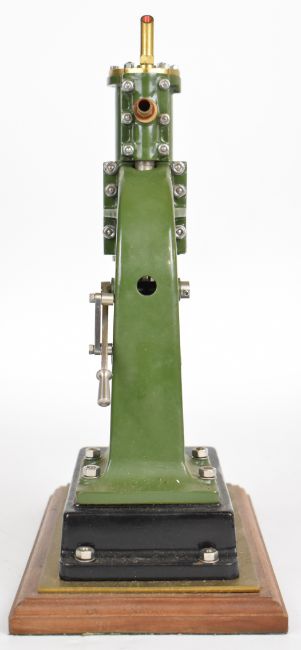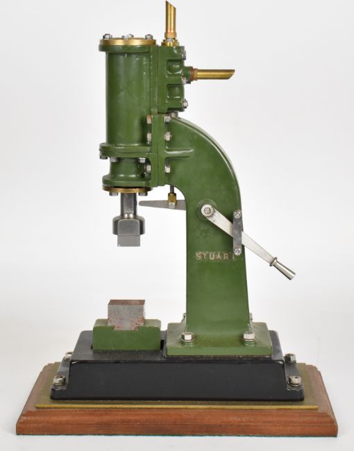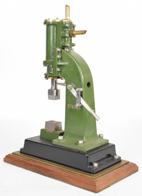 Stuart live steam forge hammer with side lever control, on wooden base, overall height 30.5cm