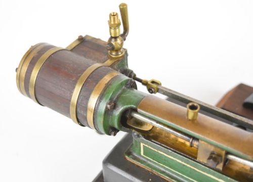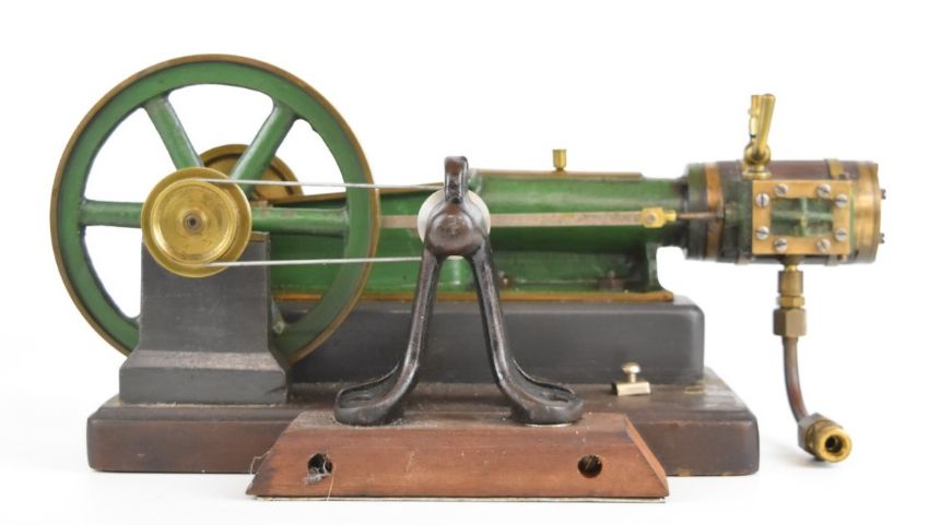 Victorian or early 20th century single cylinder live steam engine with spoked flywheel, with belt drive to attached shaft, overall length 32cm