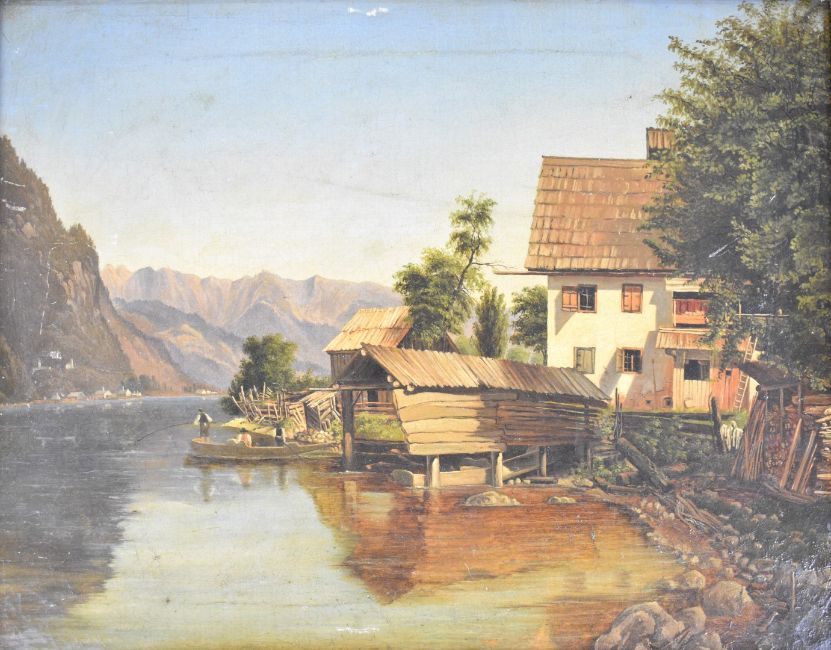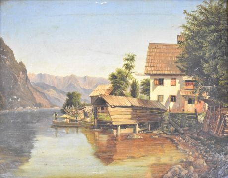 19th or early 20th century continental school oil on canvas house beside a lake with boathouse, log store and further buildings, the lake having further buildings to the far shore and mountains beyond, 38 x 48.5cm, in ornate gilt frame