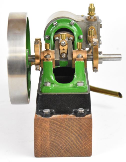 Stuart No 9 live steam single cylinder engine with oil cups to main bearings, twin cylinder drain cocks and feed water pump, on wooden base, overall length 29cm