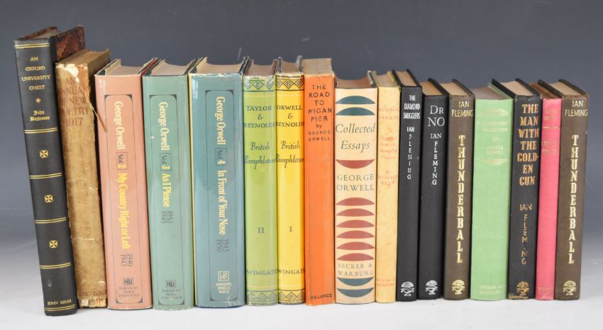 Collection of George Orwell books to include first editions of The Road To Wigan Pier published Victor Gollancz 1937, Critical Essays 1946, Collected Essays 1961, British Pamphleteers (2 volumes) by Orwell & Reginald Reynolds 1948-51, Fugitive from the Camp of Victory 1961 and Collected Essays 1940-1950 in 3 volumes 1968, together with five first edition Ian Fleming books Doctor No 1958, The Man With The Golden Gun 1965, The Diamond Smugglers 1957 and two copies of Thunderball 1961. An Annual of New Poetry 1917 with contributions by Edward Eastaway [Edward Thomas] W.H, Davies, Gordon Bottomley, Robert Frost etc. An Oxford University Chest by John Betjeman 1938 (17)