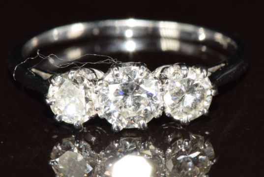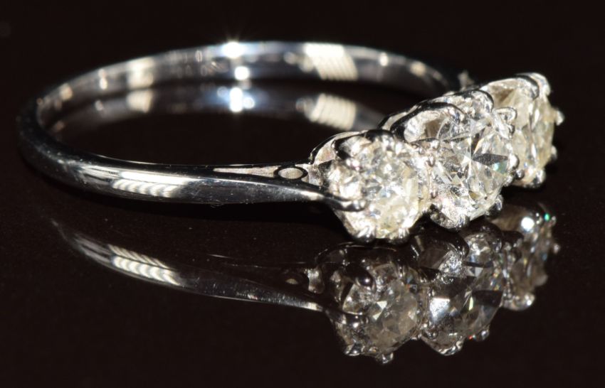 A c1930 platinum ring set with three diamonds of approximately 0.38ct, 0.25ct and 0.25ct, 2g, size K