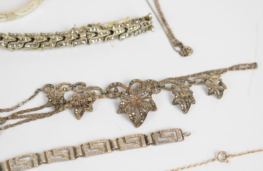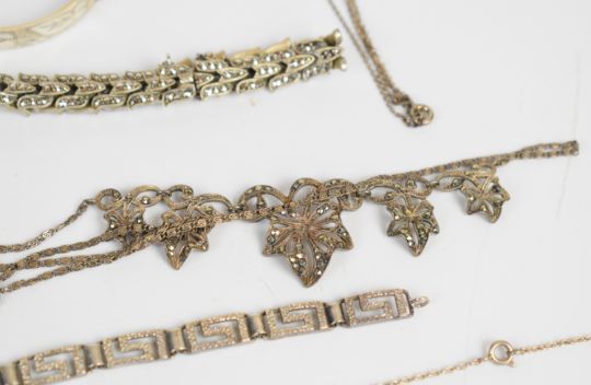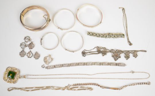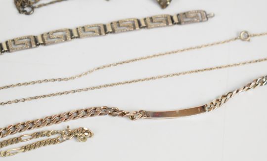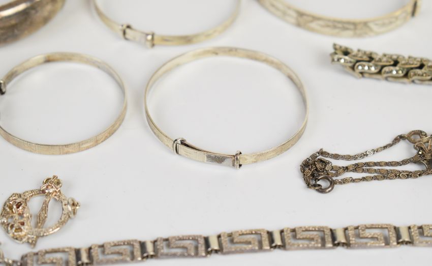 A collection of silver jewellery including two bangles, three christening bangles, Greek Key bracelet, marcasite necklace, curb link necklace, seven pendants and an identity bracelet