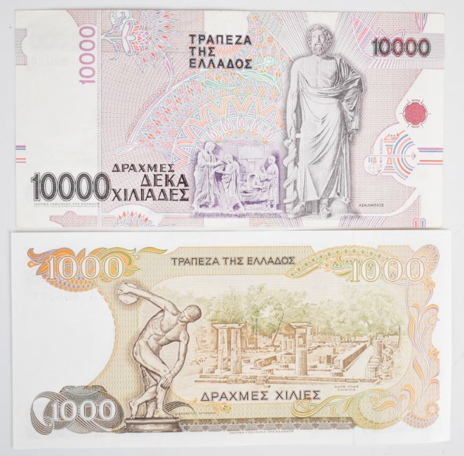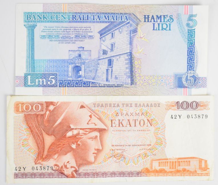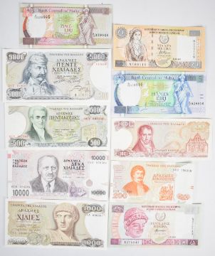 Ten Greece, Cyprus and Malta 1978-2003 banknotes including Greece 100, 500, 1000 and 5000 Drachmaes (1978-1984), a high-grade 1995 Greece 10,000 Drachmaes, a high-grade 2003 Cyprus £5 and two lightly-circulated 1994-issue Malta notes (2 and 5 Liri)