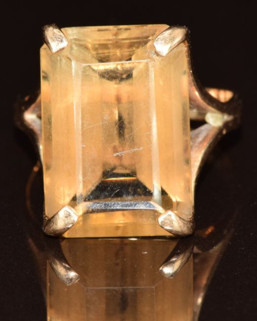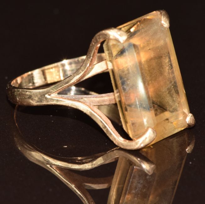 A yellow metal ring set with a smoky quartz, tests as 9k gold, 6.3g, size P