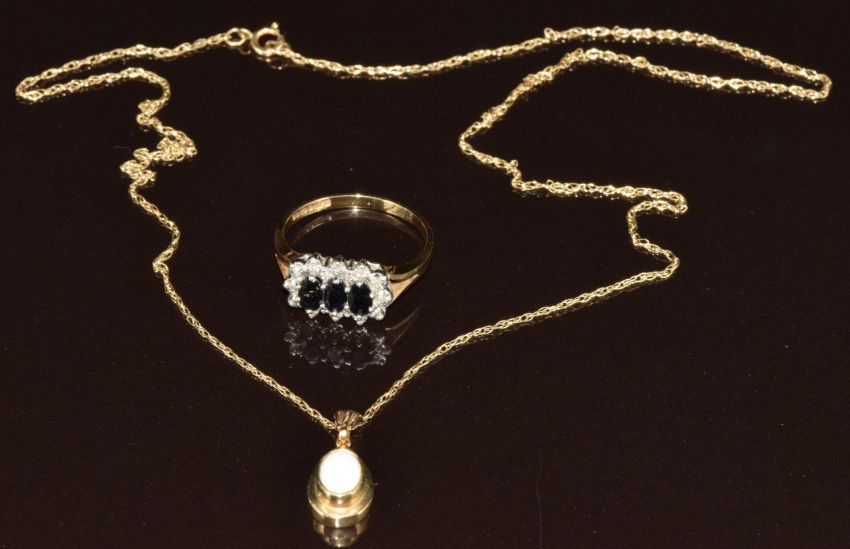 A 9ct gold ring set with three oval cut sapphires surrounded by diamonds and 9ct gold pendant set with an oval opal, on 9ct gold chain, 4.2g, size P, 45cm