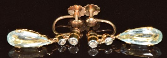 A pair of 9ct gold earrings each set with an pear cut aquamarine and two diamonds, 4.3g, 2.3cm