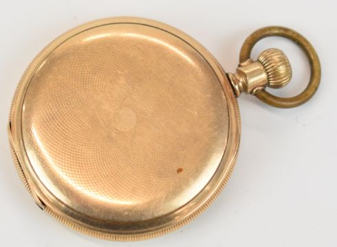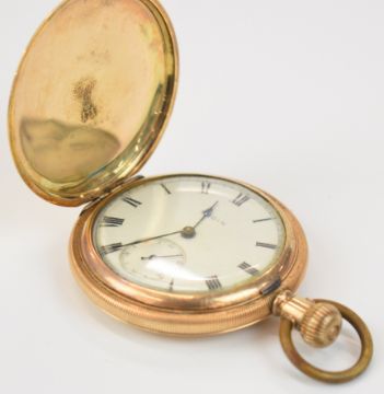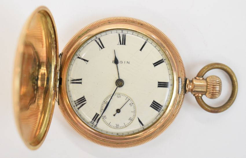 Elgin gold plated keyless winding full hunter pocket watch with inset subsidiary seconds dial, blued hands, black Roman numerals, white dial and signed and engraved 7 jewel movement, case diameter 51mm, serial number 16873470.