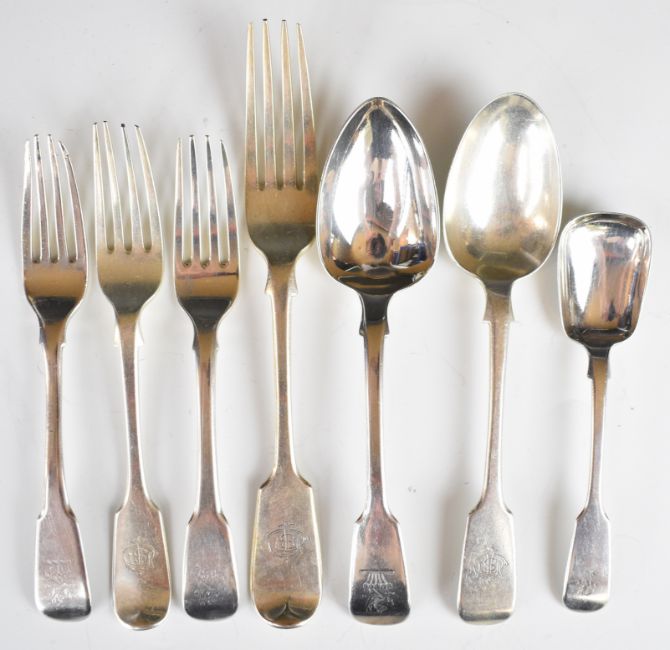 Georgian and later hallmarked silver fiddle pattern cutlery comprising table fork, three dessert forks, three dessert spoons and a sugar or tea caddy scoop, length of longest 20.5cm, weight of all items 343g
