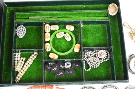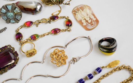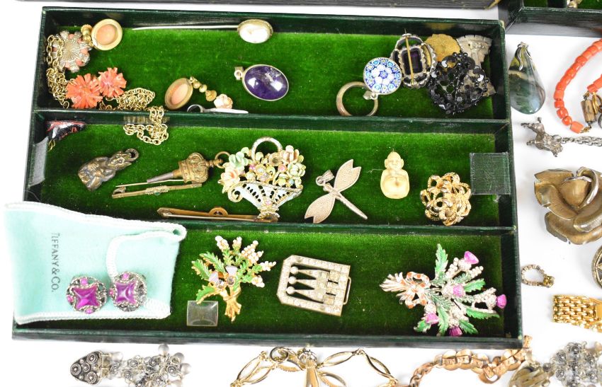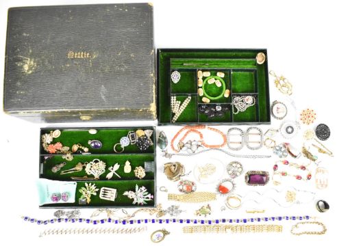 A collection of jewellery including silver brooch, coral necklace, white metal buckles, yellow and white metal studs set with mother of pearl, brooches including Exquisite, Sarah Coventry and two Miracle, Napier necklace, Hollywood pendant, etc in tooled leather box