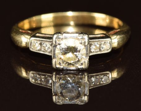 An 18ct gold ring set with a round cut diamond of approximately 0.35ct and two further diamonds to each shoulder, 2.2g, size K