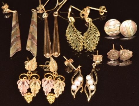 Seven pairs of 9ct gold earrings including tri-coloured, filigree, etc , 8.1g