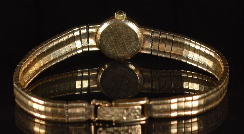 Omega 9ct gold ladies wristwatch with two-tone hands and baton hour markers, silver dial and signed 17 jewel calibre 650 movement, on 9ct gold bracelet, case diameter 15mm, serial number 19576026, 22.8g.