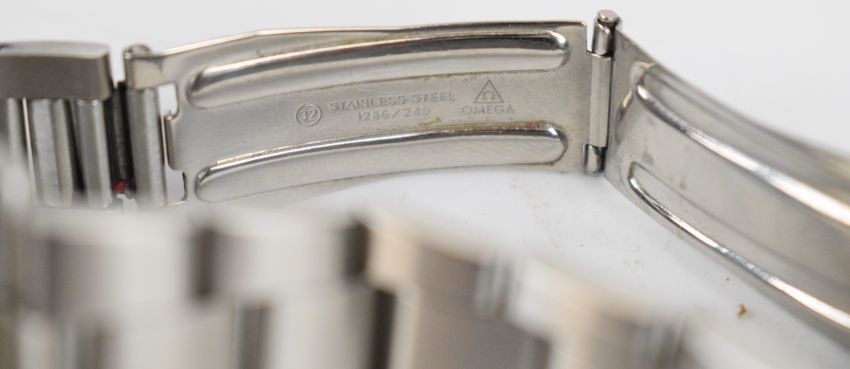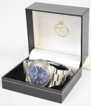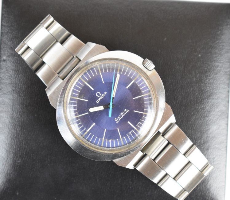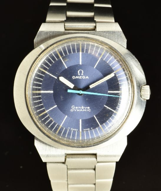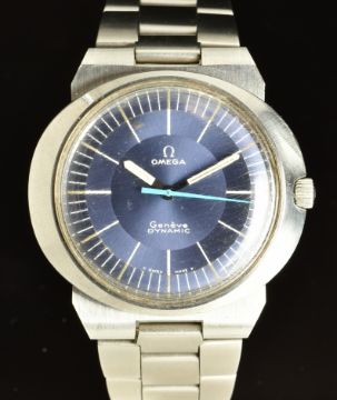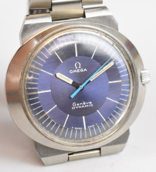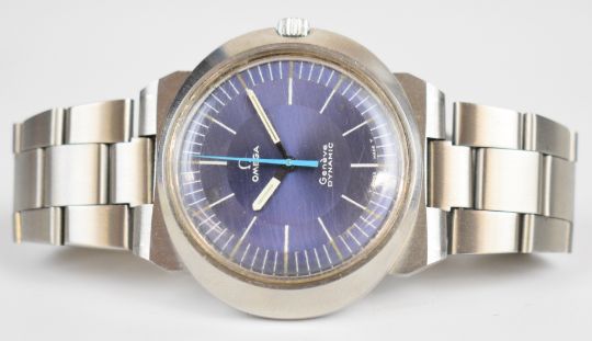 Omega Dynamic gentleman's wristwatch with luminous hour and minutes hands, pale blue centre seconds hand, silver and white baton markers, blue dial, stainless steel case and signed movement, on stainless steel bracelet, case diameter 41mm.