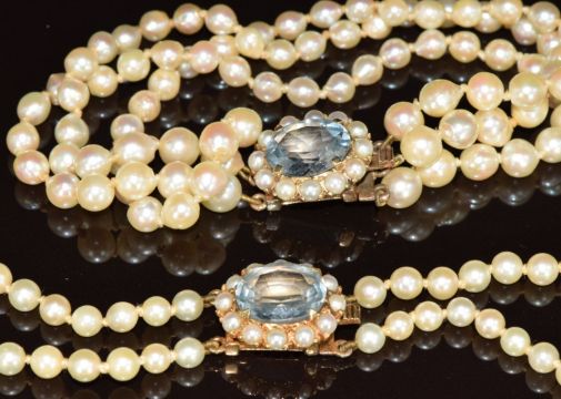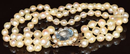 A double strand cultured pearl necklace with matching bracelet, both with 9ct gold clasps set with an oval cut topaz surrounded by pearls, 46.3g
