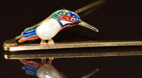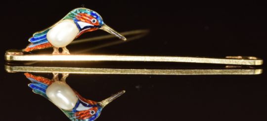 A 15ct gold brooch in the form of a kingfisher set with enamel and a blister pearl, 3g, 5cm