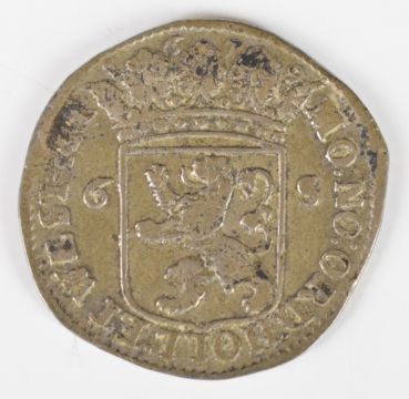 1679 Netherlands Province of Holland silver Six Stuivers 'Scheepjesschelling', legends read MO NO ORD HOLL ET WESTFRI on the obverse and VIGILATE DEO CONFIDENTES on the reverse.