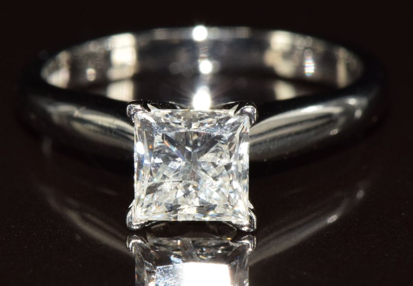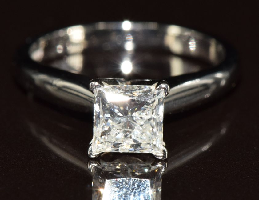 A platinum ring set with a princess cut diamond of approximately 1ct, 4.7g, size K