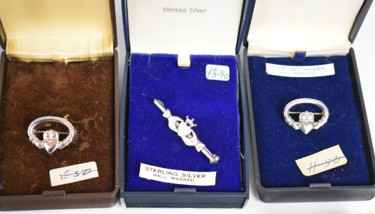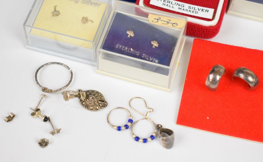 Thirteen pairs of silver earrings including mushrooms, hearts, horseshoe, shamrocks, etc, four silver Claddagh brooches, silver Claddagh cufflinks, silver metamorphic brooch set with marcasite, Norwegian silver earrings set with enamel, single earrings, etc