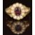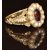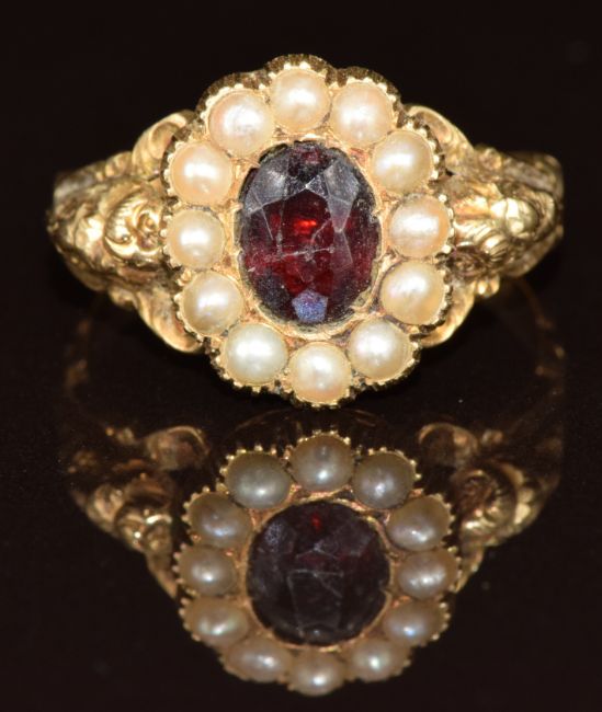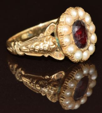 A Victorian 9ct gold ring set with a foiled garnet surrounded by split pearls, 2.9g, size M