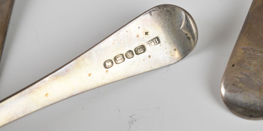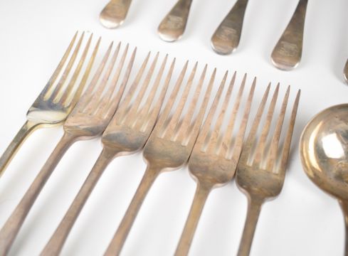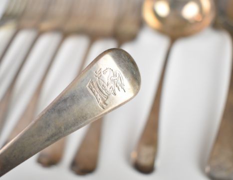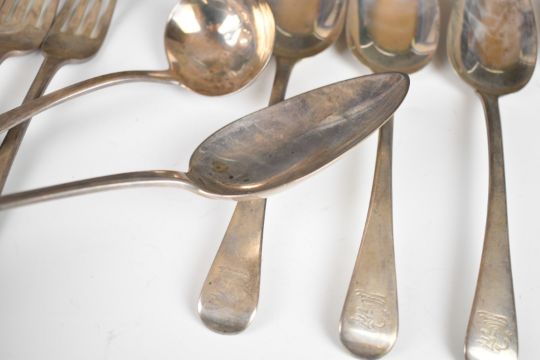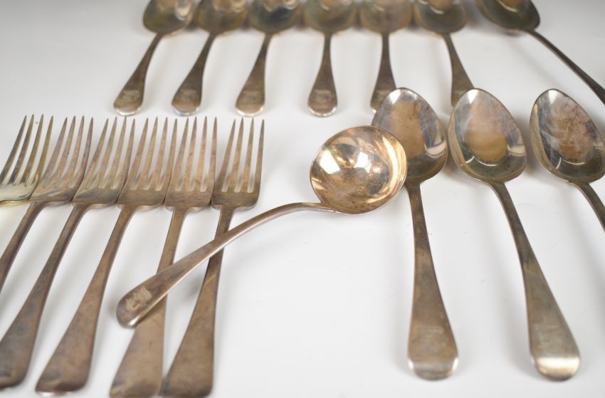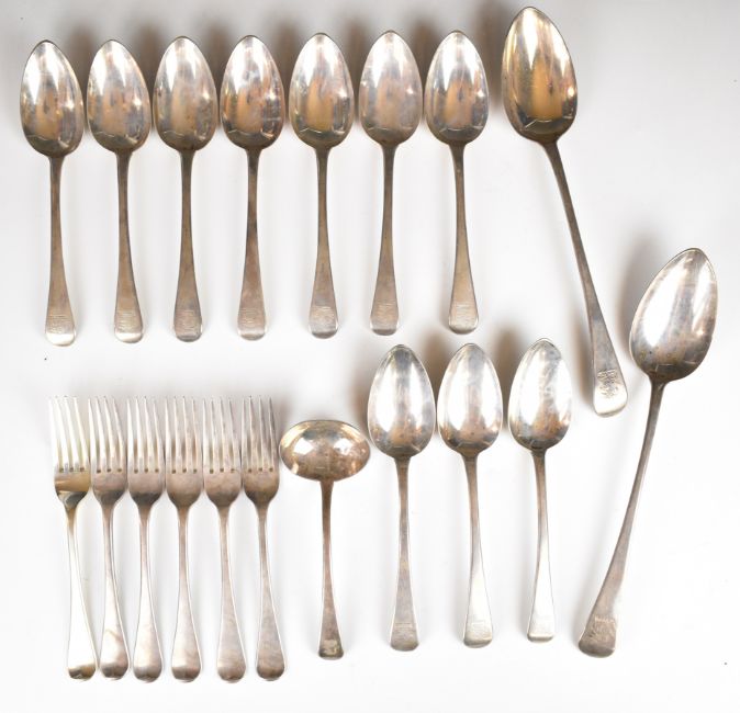 Georgian hallmarked silver canteen of Old English pattern cutlery comprising ten table spoons, six table forks, two basting spoons and a sauce ladle, London 1821, maker Thomas Wilkes Barker, length of longest 30cm, weight of all items 1315g