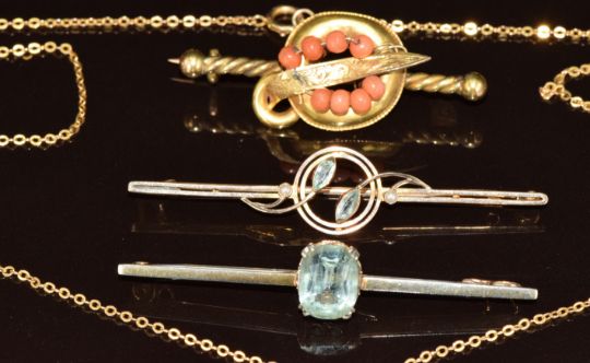 Two 9ct gold brooches (5g), Edwardian 9ct gold pendant set with seed pearls and aquamarine on 9ct gold chain (2.7g) and a Victorian yellow metal brooch set with coral beads (5g)