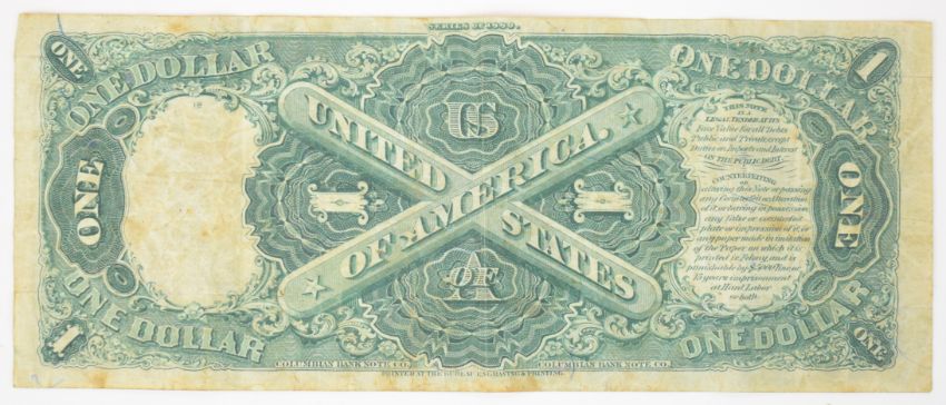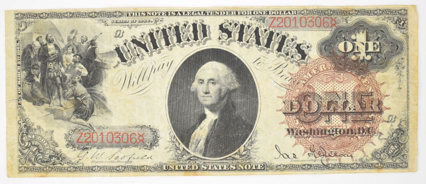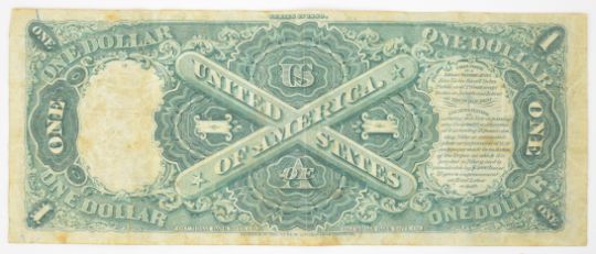 United States of America Series 1880 'sawhorse' $1 banknote, signed by G W Scofield and J Gilfillan first signature pairing of this series, 1880-1881 (Scofield was only Register of The Treasury until May 1881), seven digit serial number, large brown seal and red serial numbers (Friedburg type Fr #28; pick 176a), no pinholes, no tears