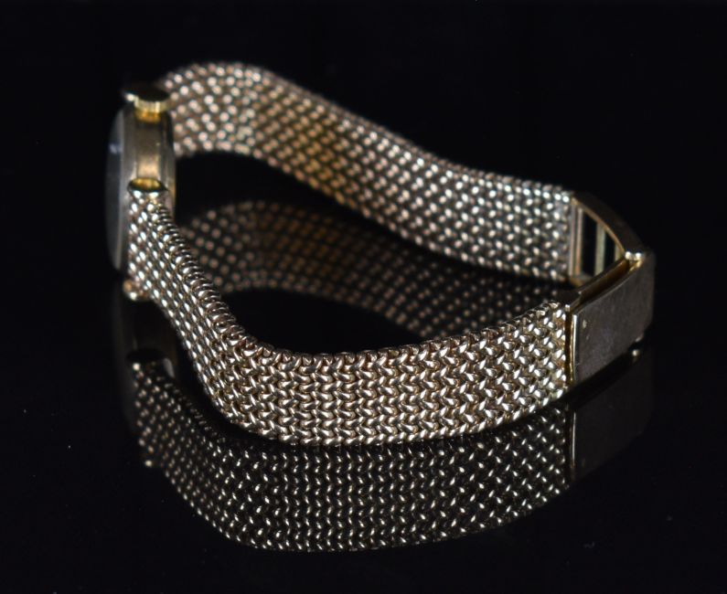Jaeger LeCoultre 9ct gold ladies wristwatch with gold hands and hour markers, silver dial and signed movement, on 9ct gold bracelet, case diameter 19mm, serial number 1376951, 29.4g.