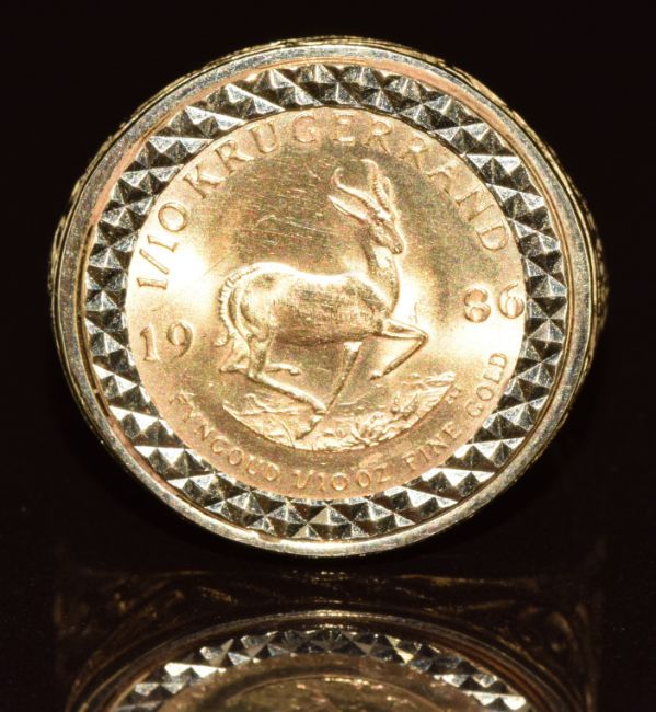 A 9ct gold ring set with a 1986 1/10 krugerrand, 7.5g, size O