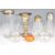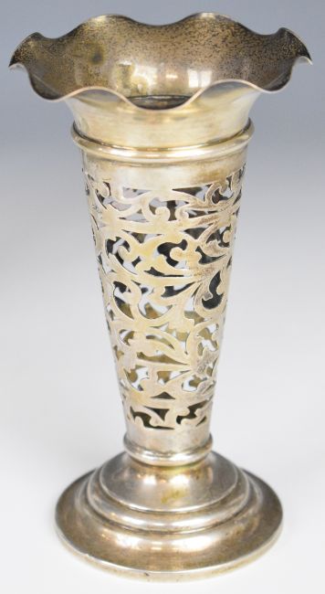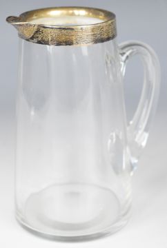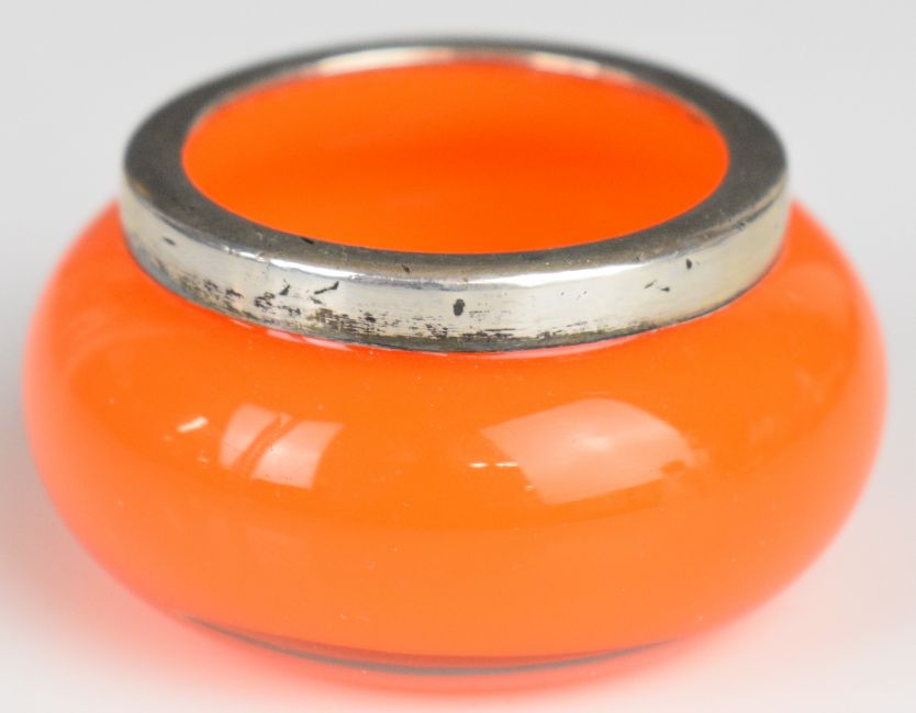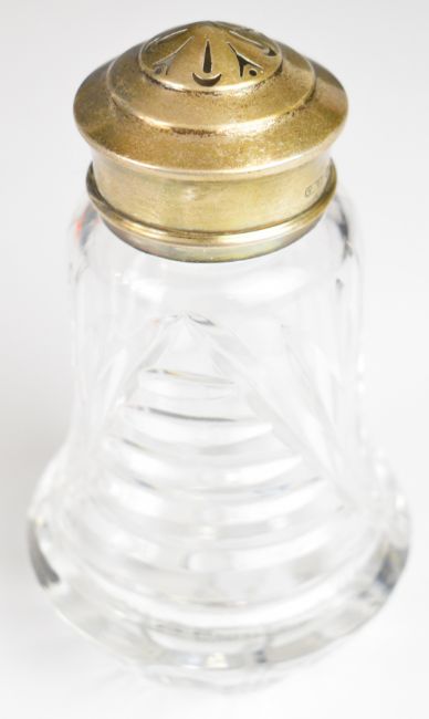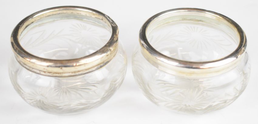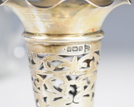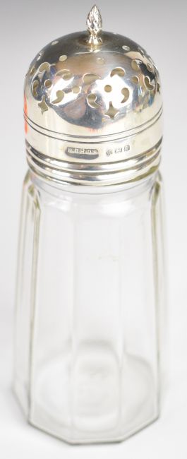Hallmarked silver mounted items comprising lemonade jug, two sugar casters, trumpet vase, pair of salts and an orange glass salt, the jug Birmingham 1919, maker John Grinsell & Sons, height 15cm
