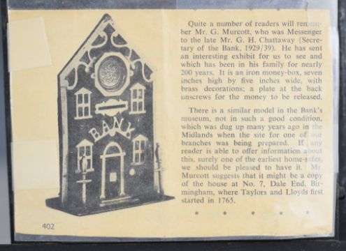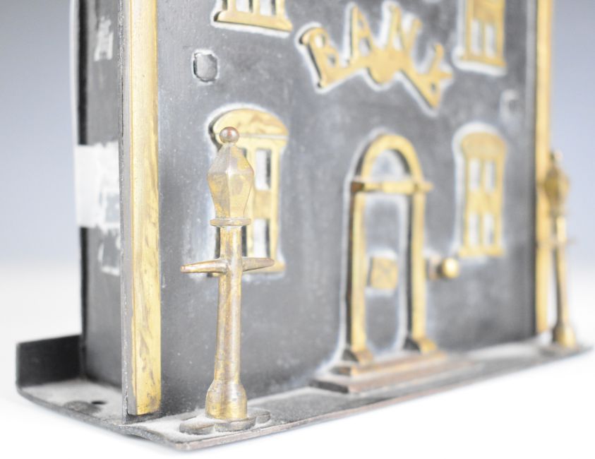 Victorian metal and applied brass 'Bank' moneybox, W16 x H21cm