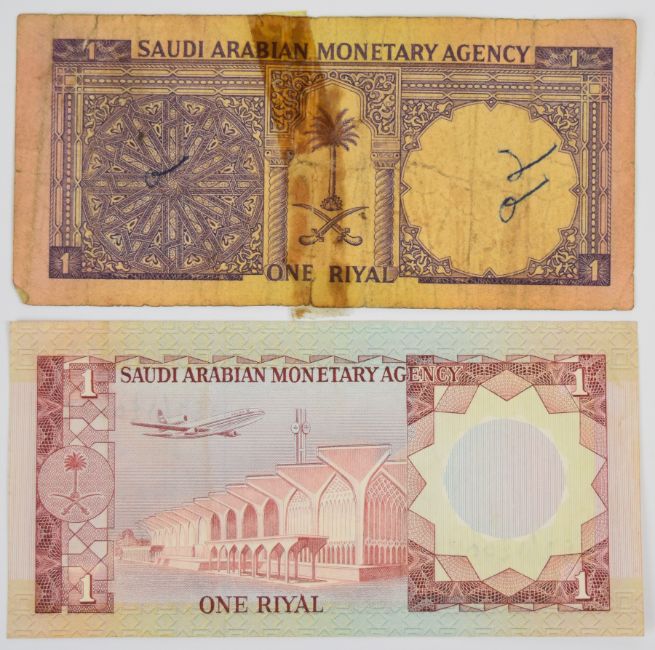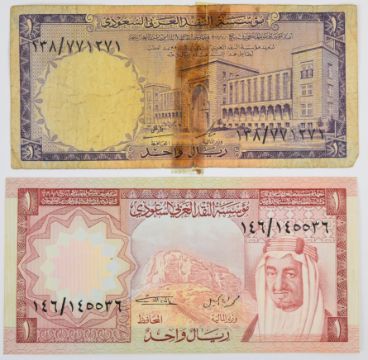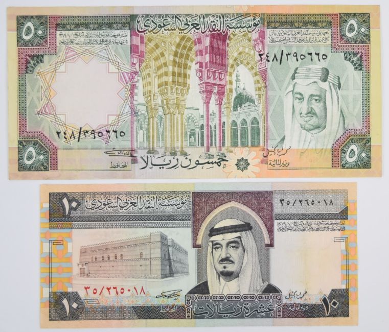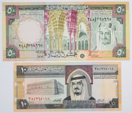 Ten Saudi Arabia 1968-1984 banknotes consisting of 1976; 1977 issue (undated) 1, 5, 10 and 50 Riyals, 1, 5 and 10 Riyals from 1983-84 and three lower-grade 1968 (undated) notes including a 10 Riyal note (with four pinholes, annotation)