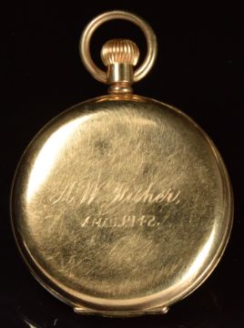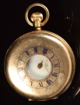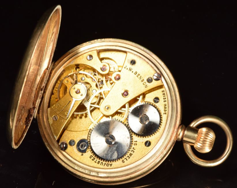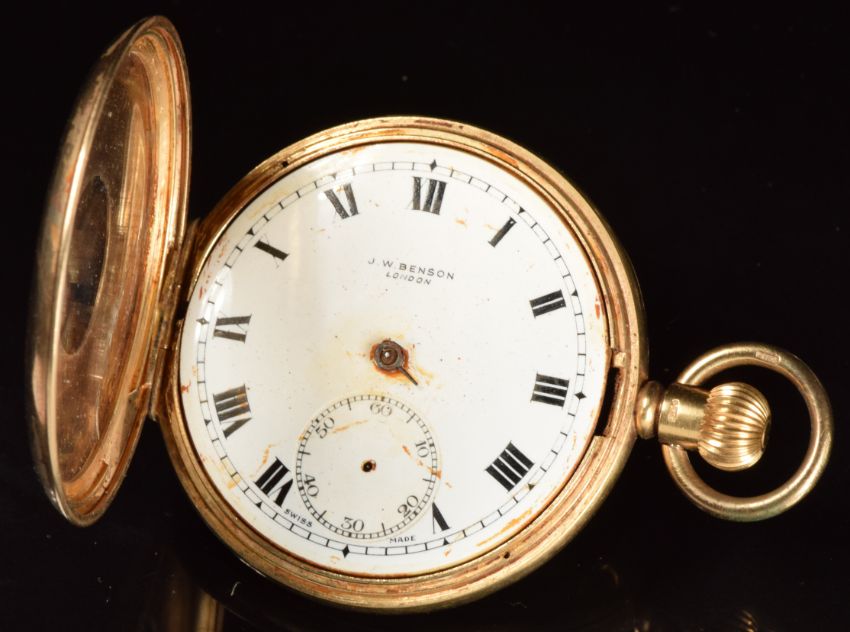 J W Benson 9ct gold keyless winding half hunter pocket watch with subsidiary seconds dial, black Roman numerals, white dial, inlaid blue enamel Roman numerals to the case and signed 15 jewel movement, case diameter 49mm, serial number 683104, 88.2g.