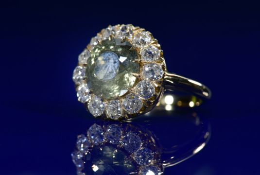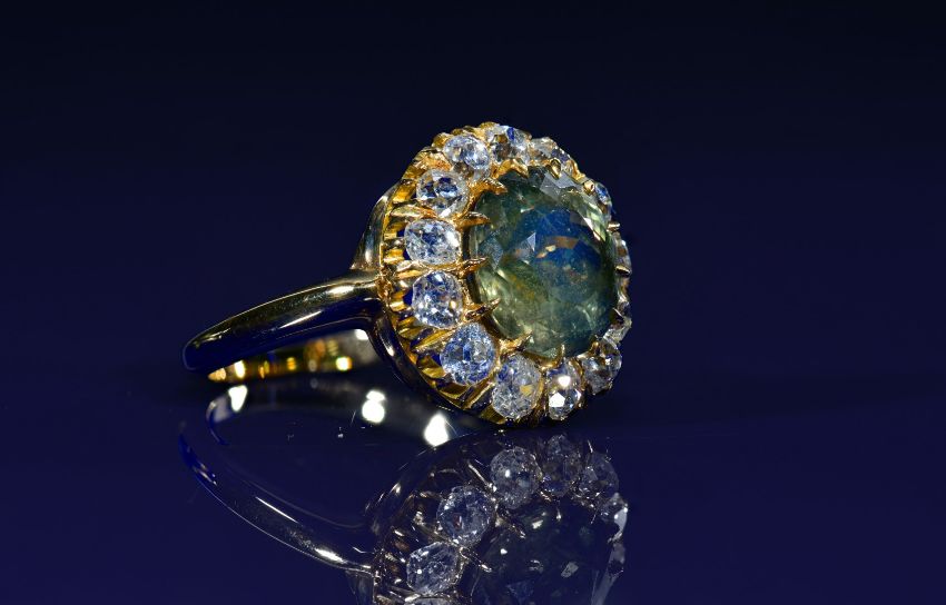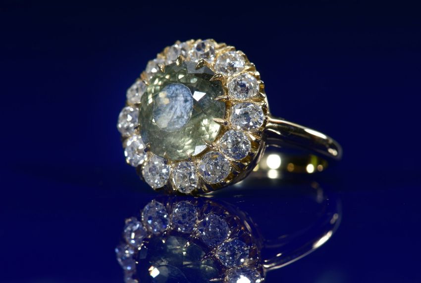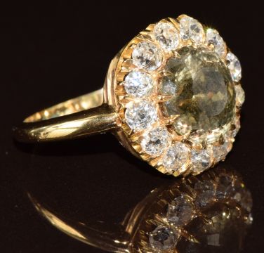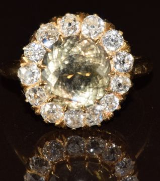 French Belle Époque 18ct gold ring set with a green-yellow colour change sapphire of approximately 5ct surrounded by thirteen old cushion cut diamonds, the total diamond weight approximately 1.3ct, with GIA certificate stating the sapphire is unheated and displays a colour change, and an insurance valuation for £13,500, size O