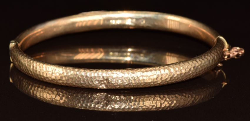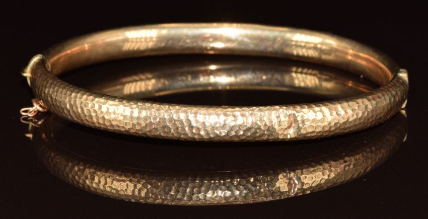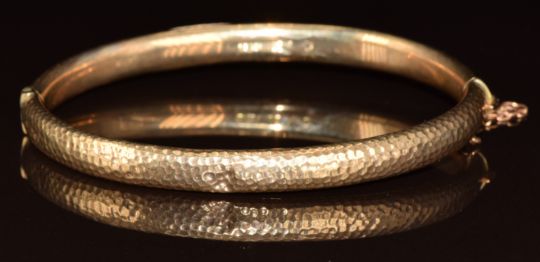 Edwardian 9ct gold bangle with hammered decoration, 7.3g, 6.2 x 5cm
