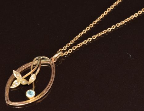 A 9ct gold necklace set with seed pearls and paste, on 9ct gold chain, 5.3g, 42cm, 3.4cm