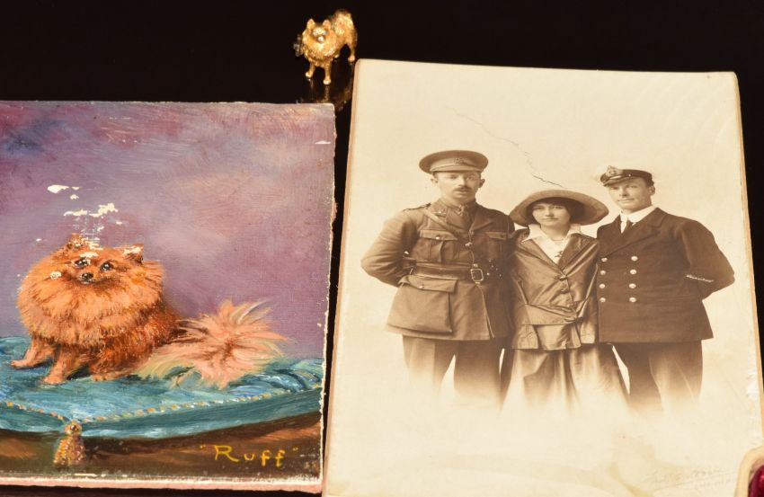 A 9ct gold brooch in the form of 'Ruff' a Pomeranian dog, with old cut diamond eyes (13.6g, 2.1x1.9cm), c1910 together with a related photograph of Mrs Needham the original owner and an E M Nelson oil painting entitled Ruff, 15.5x10cm.