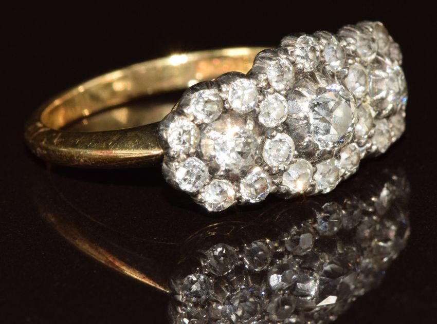 An 18ct gold ring set with diamonds in three clusters, the centre diamond approximately 0.25ct, 4.5g, size O