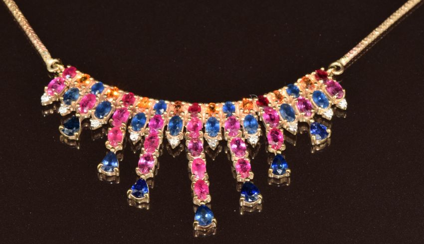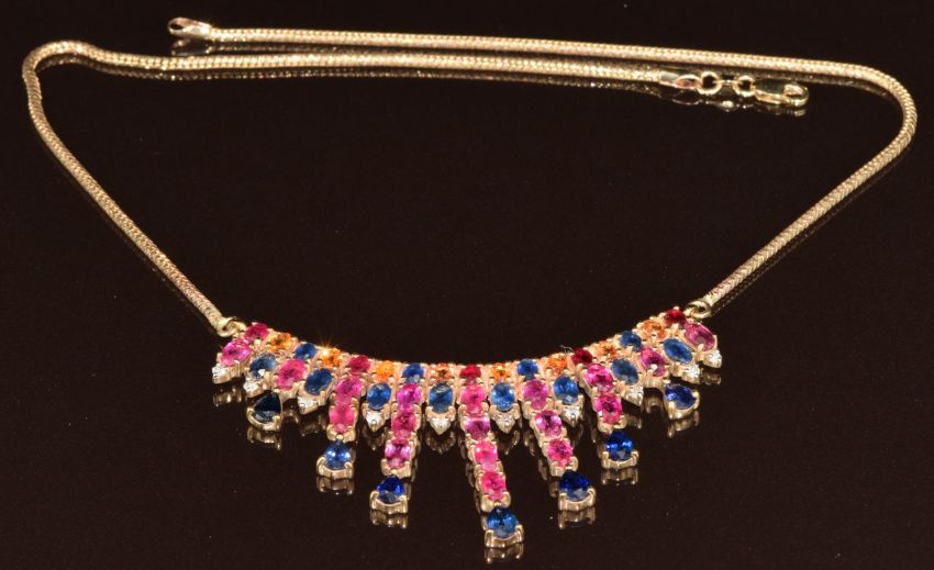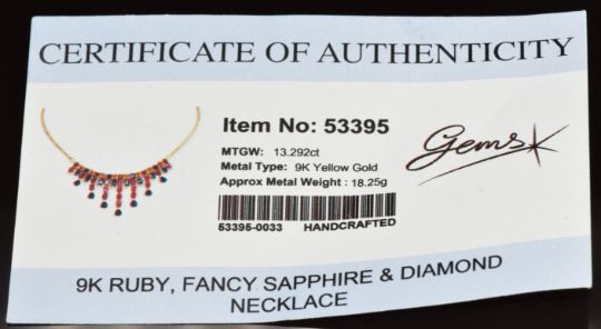 A 9ct gold necklace set with twenty three oval rubies totalling approximately 6.3ct, nineteen blue sapphires total 5.4ct, eight golden sapphires total 1.3ct and ten round cut diamonds total 0.2ct, with certificate, 19.6g
