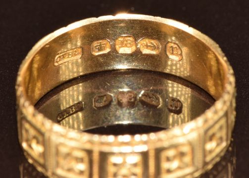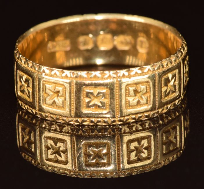 Victorian 18ct gold ring with engraved decoration, Birmingham 1887, 4.4g, size P/Q