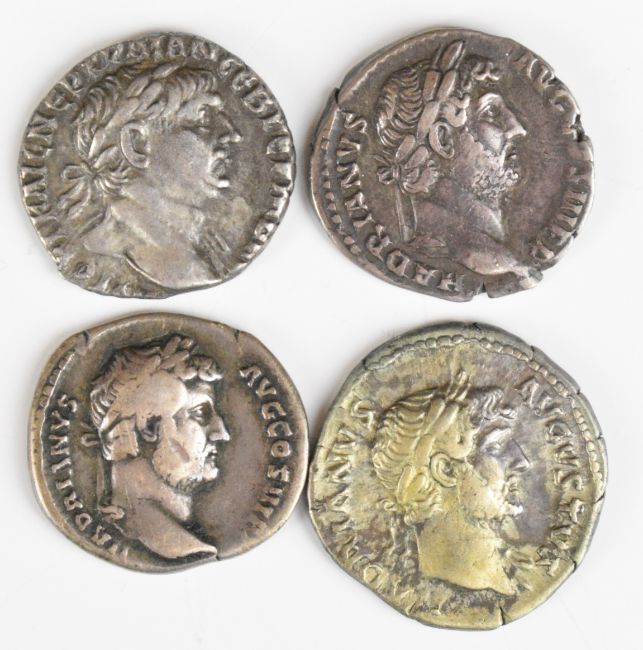 Four Roman silver Denarius of Hadrian, all 117-138AD laureate head right, comprising rev Egypt reclining left; rev Arabia standing, head left; rev Victory facing right and holding wreath and rev emblems of the augurate and pontificate
