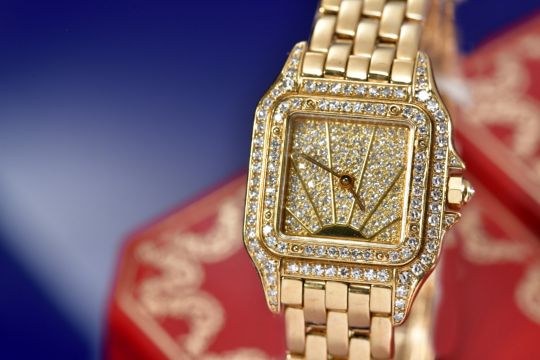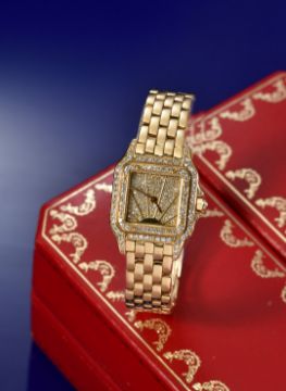 Cartier Panthère 18ct gold ladies wristwatch with diamond set Sunburst dial, gold hands, diamond set bezel and case and quartz movement, on 18ct gold bracelet, case diameter 22mm, serial number 8669197409, 69.8g, in original fitted box.