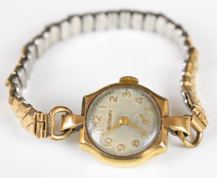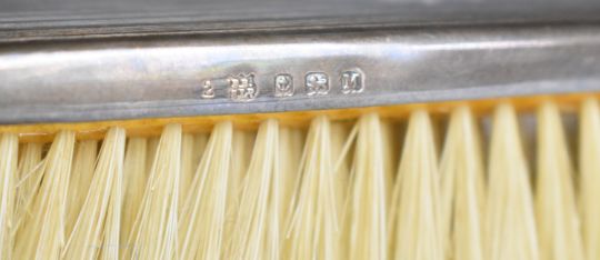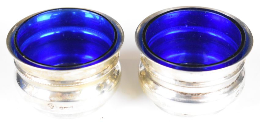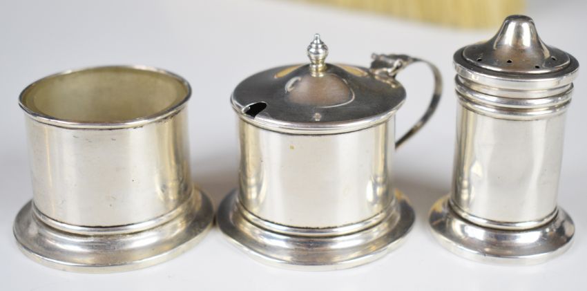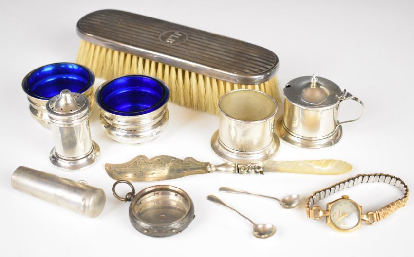 Hallmarked silver items comprising three piece cruet set with clear glass liners, pair of open salts with blue glass liners, cheroot holder case with hallmarked silver mounted cheroot holder, mother of pearl handled butter knife, hallmarked silver mounted brush, pocket watch case marked 0935 and a Rotary 9ct gold cased wristwatch, 81g weighable silver, weight of gold watch case back 2.2g