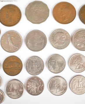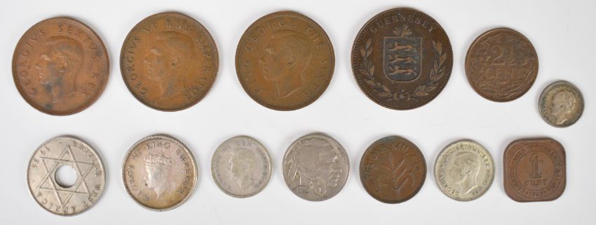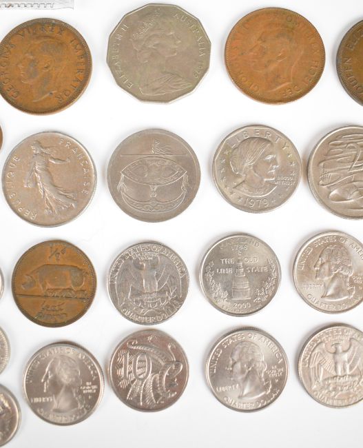 Small collection of world coins and banknotes including some silver coins and redeemable currency from Australia and New Zealand, together with two commercial Bank of Scotland £1 banknote,s one dated 1956 and the other 1964