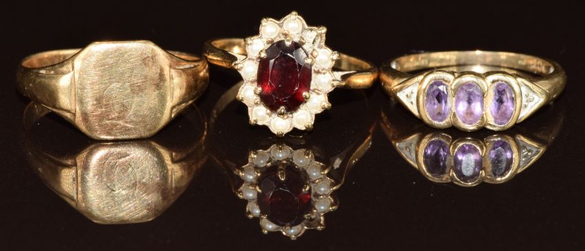 Three 9ct gold rings, one set with amethysts, one garnet surrounded by pearls and the other a signet ring, 8.4g, size P, O & Q